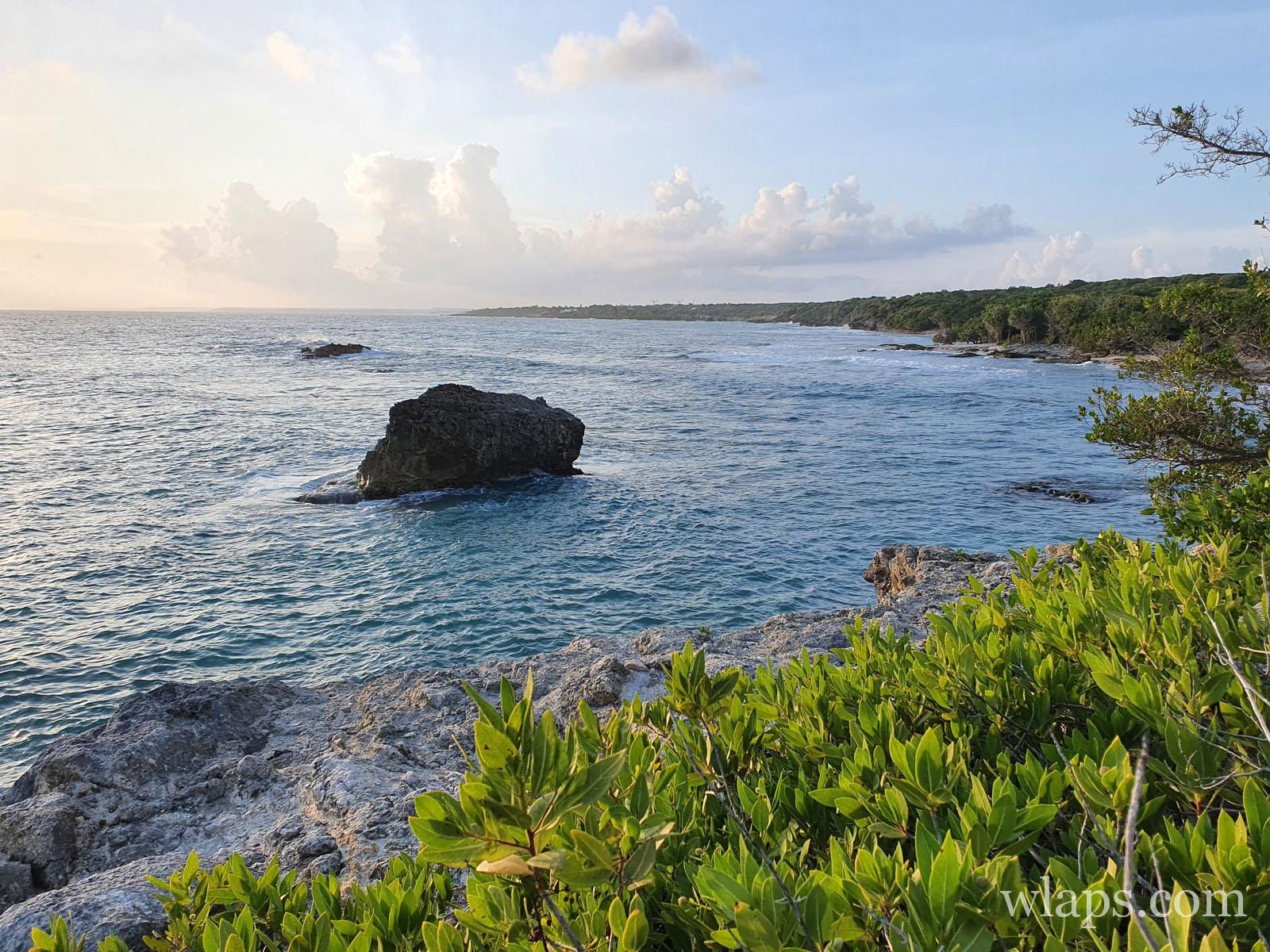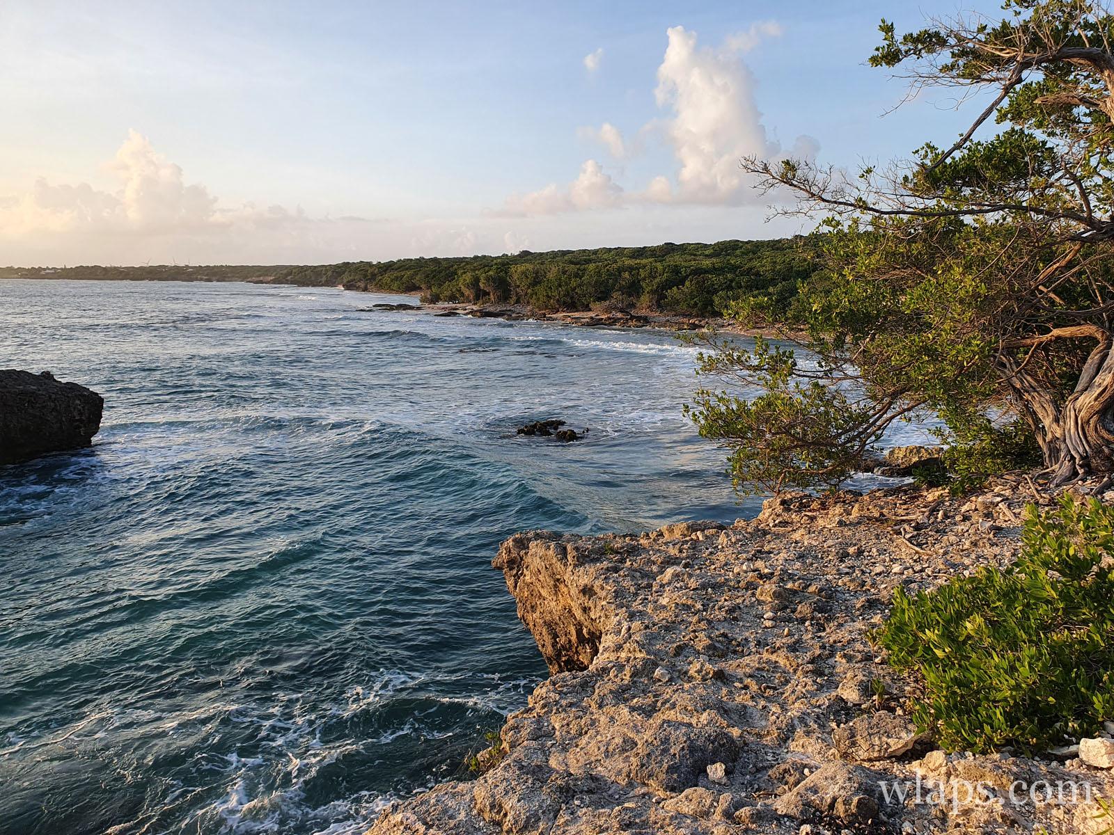C’est ici que le sentier de randonnée débute derrière les rochers. Emprunter le chemin bien tracé qui s’enfonce dans la végétation sèche. On se trouve ici tout proche de la très belle Anse Kahouanne (fantastique plage secrète), sur notre droite. Après quelques minutes de marche pratiquement à plat, on distingue une sorte de pointe rocheuse qui s’avance dans la mer. Se diriger vers elle en quittant le chemin, et faire attention où on pose les pieds car on peut vite s’égratigner.