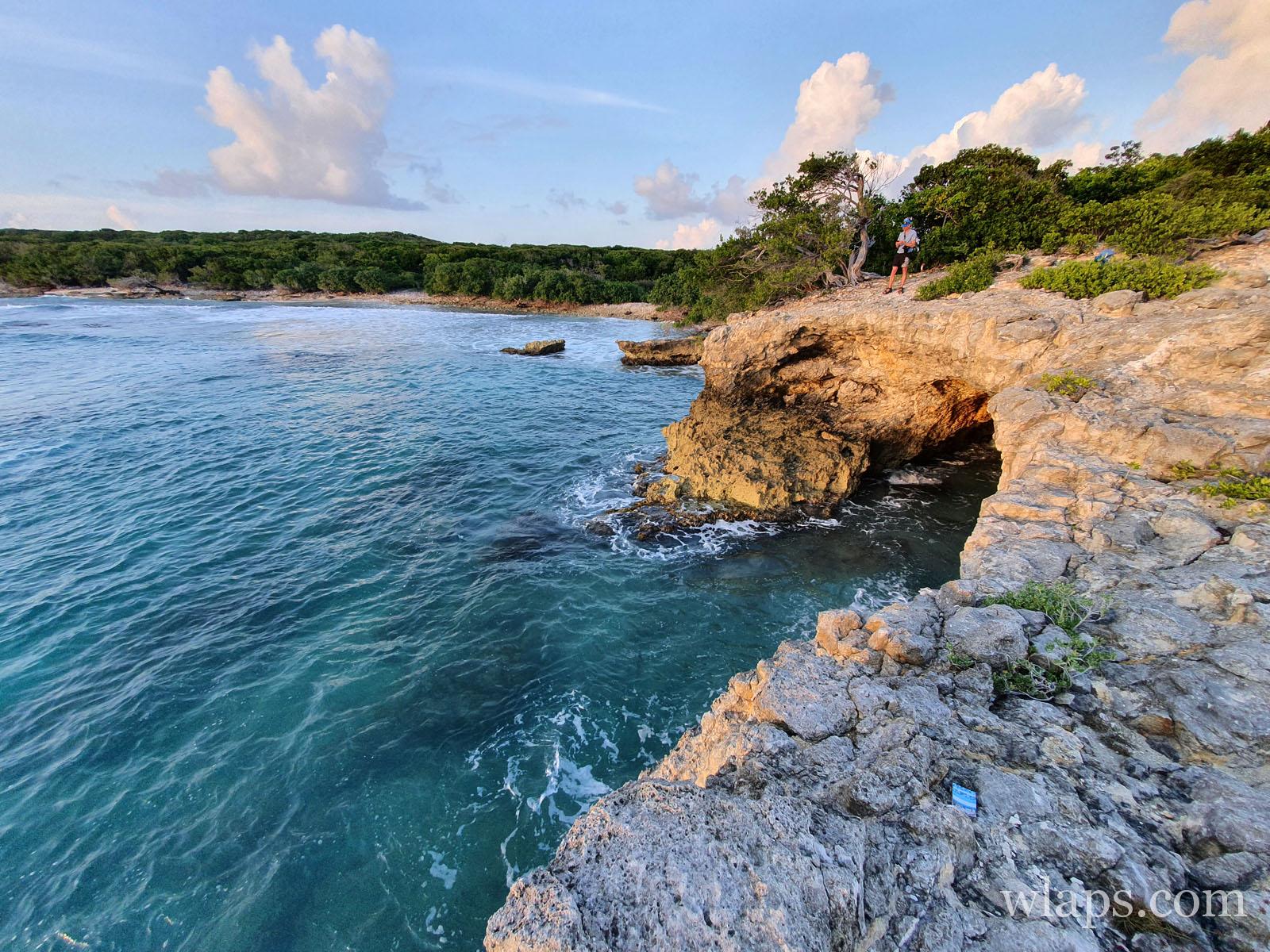 On peut aussi se rendre à cette grotte en suivant le sentier de randonnée qui fait une boucle. Celle-ci monte à la croix de la Pointe des Châteaux. Puis au moment de redescendre par les escaliers, prenez à gauche pour suivre le chemin qui va vers la végétation proche des falaises. Après un moment, vous arriverez à la superbe Baie Degrat. Au lieu de terminer la boucle en retournant au parking (point de départ), il vous faut poursuivre tout droit vers l’Anse Kahouanne pour découvrir cette grotte. À faire en aller-retour par exemple depuis là.