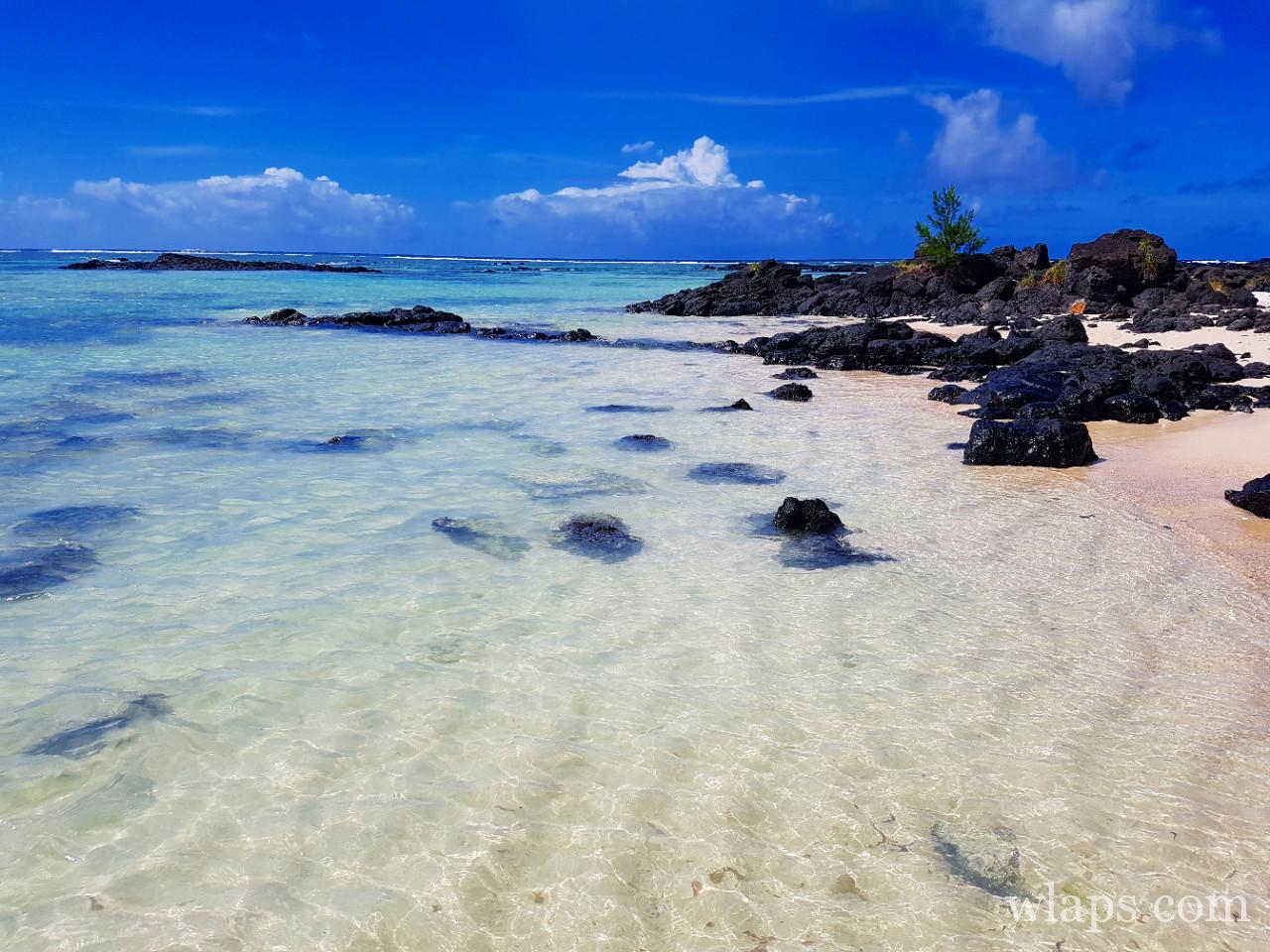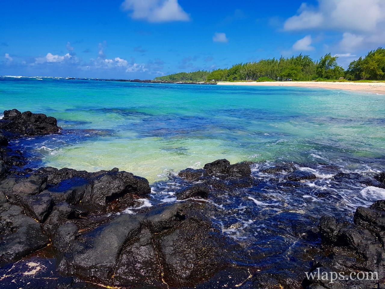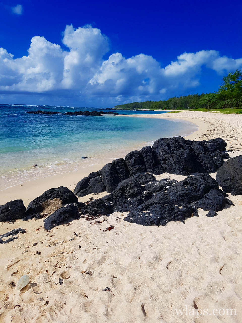 Si on reprend la voiture et qu’on roule quelques minutes en « longeant » les constructions qui longent la mer on arrive à la suite de la plage de Palmar. Quelques filaos offrent une ombre bienfaitrice et des gros rochers noirs rendent le coin ultra photogénique. Mais ce bout de plage est en bord de route et on a vue sur le grand mur sur la droite de Villa Palmar Bay. Pas top.