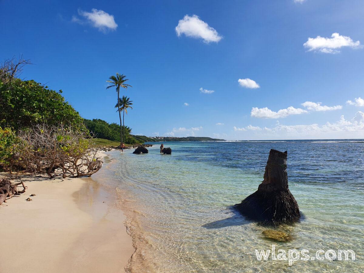 Alors si vous résidez du côté de Deshaies, surtout faites cette randonnée. Tout d’abord sachez qu’elle débute dans la forêt et ensuite passe le long de plusieurs plages de toute beauté. Il n’est pas nécessaire de chausser de grosses chaussures de marche mais tout de même des sandales de marche. Et puis c’est génial car vous pouvez faire des pauses baignade durant cette balade. Pensez à garer un véhicule au point d’arrivée ou revenez en stop comme nous. Pour conclure la rando, vous arriverez à la plage de la Perle, d’une rare beauté.