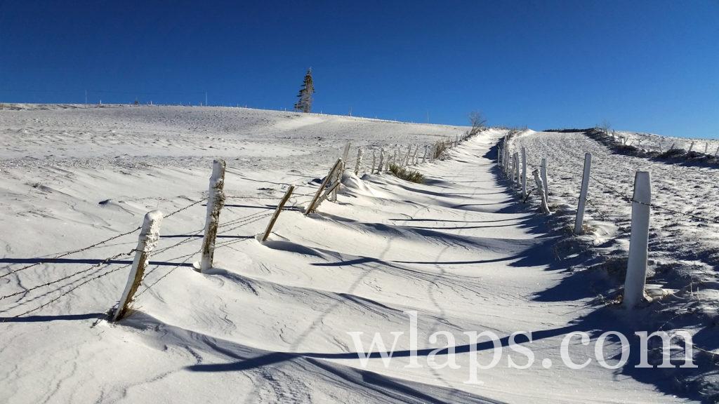 Départ : au croisement qui va vers St Urcize, on se gare le long de la route ou sur la place faite par le chasse-neige. Voir sur Maps ici.